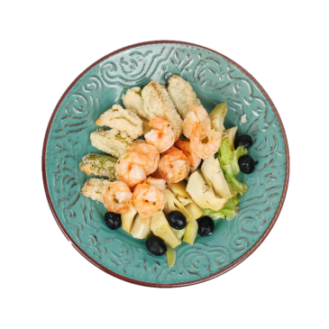 C. Zucchini and King Prawns Salad: King Prawns, breadcrumbs, salt, pepper, olive oil, lemon juice, fresh basil, fresh parsley, shrimps, olives, artichokes, salad mix.